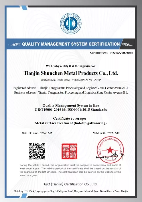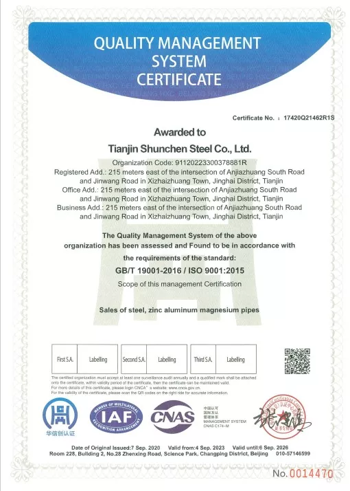 Standardi: GB/T 3091-2015 "Varjene jeklene cevi za nizkotlačni transport tekočin", GB/T 13912-2020 "Vroče pocinkane jeklene cevi". Izdelek je opravil testiranje tretjih oseb in ima poročilo o preskusu.