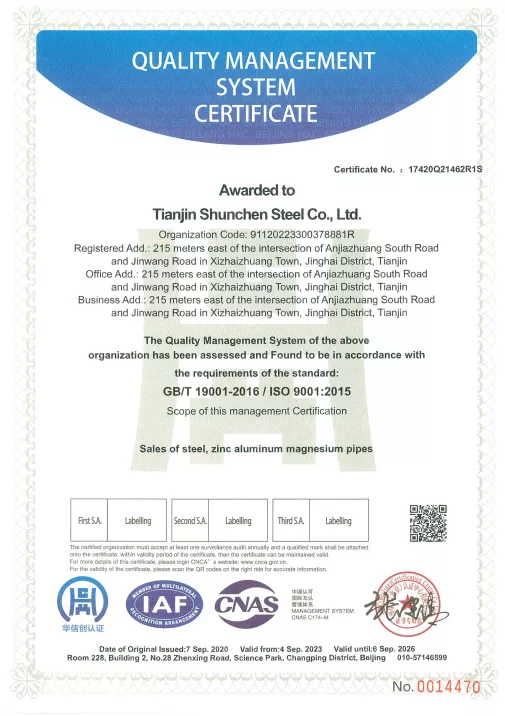 Naše pocinkane okrogle cevi so na voljo v širokem razponu specifikacij, s 236 različnimi velikostmi za izpolnjevanje različnih potreb. Naši izdelki imajo certifikat ISO9001, certifikate ISO 9000, sistem 3A in certifikat EU CE. Ponujamo tudi poročila o materialih, potrdila o testiranju debeline cinkove prevleke in poročila tretjih oseb o pregledu kakovosti. Izbira pocinkanih okroglih cevi Shunchun vam ne zagotavlja samo nakupovalnih storitev na enem mestu, temveč tudi 24/7 poprodajno podporo in sledenje v realnem času na 18 ključnih točkah, zaradi česar je vaša nabava bolj brezskrbna in zanesljiva.