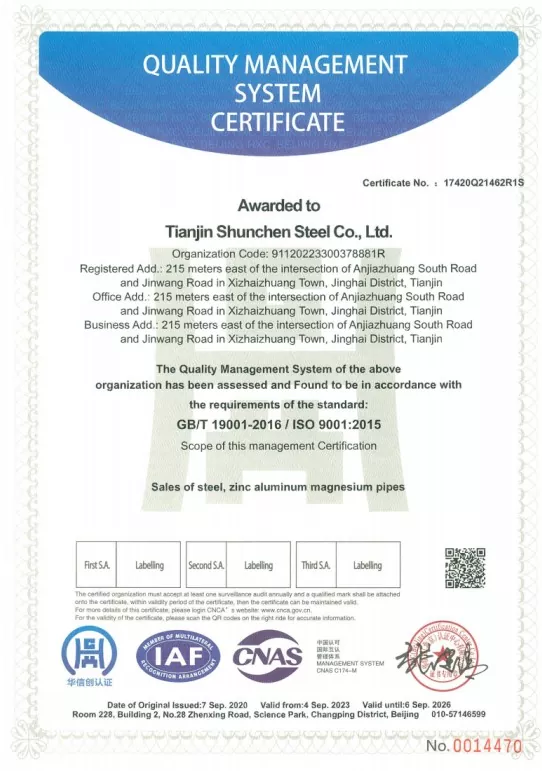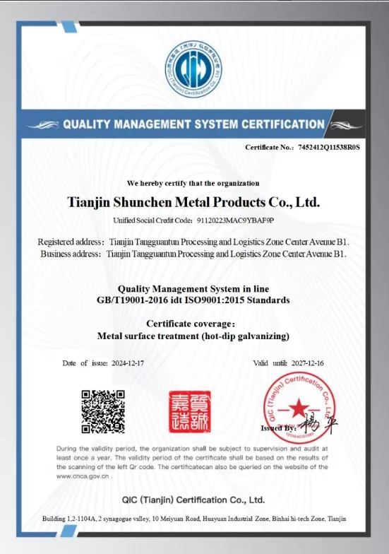 Industrijsko podjetje Tianjin Shunchen je nabralo več kot tri desetletja proizvodnih izkušenj v jeklarski industriji. Podjetje ima sistemske certifikate ISO 9000, 3A, kot tudi certifikat CE Evropske unije in je vzpostavilo celotno industrijsko verigo od obdelave galvanizacije do prodaje in distribucije. S strogimi 12-stopenjskimi procesnimi tokovi in tristopenjskim celovitim inšpekcijskim mehanizmom je podjetje že 12 zaporednih let doseglo rekord nič letnih nesreč glede kakovosti in varnosti ter ničelnih napak pri naročilu. Shunchen Industrial vzdržuje celoletno zalogo pocinkanega jekla v višini več kot 20.000 ton, kar tvori obsežen supermarket pocinkanega jekla, ki združuje skladiščenje in distribucijo. Skladišče pokriva površino 10.000 kvadratnih metrov in zagotavlja trdno podporo integrirani proizvodnji in prodajnim storitvam.